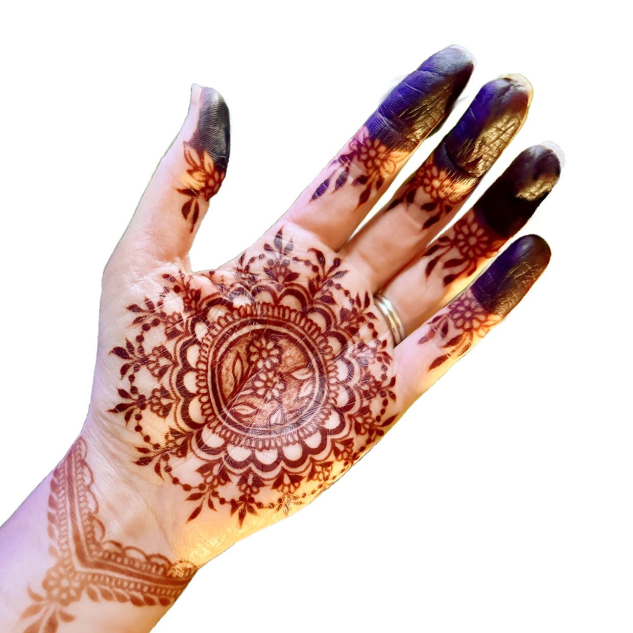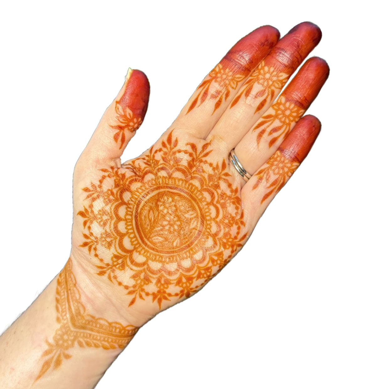 Henna stains start out orange-red. It will be darker on your palms, and lighter elsewhere. Don't panic, trust the process! Within 24-48 hours it develops into a deep red-brown (almost black on the palms).